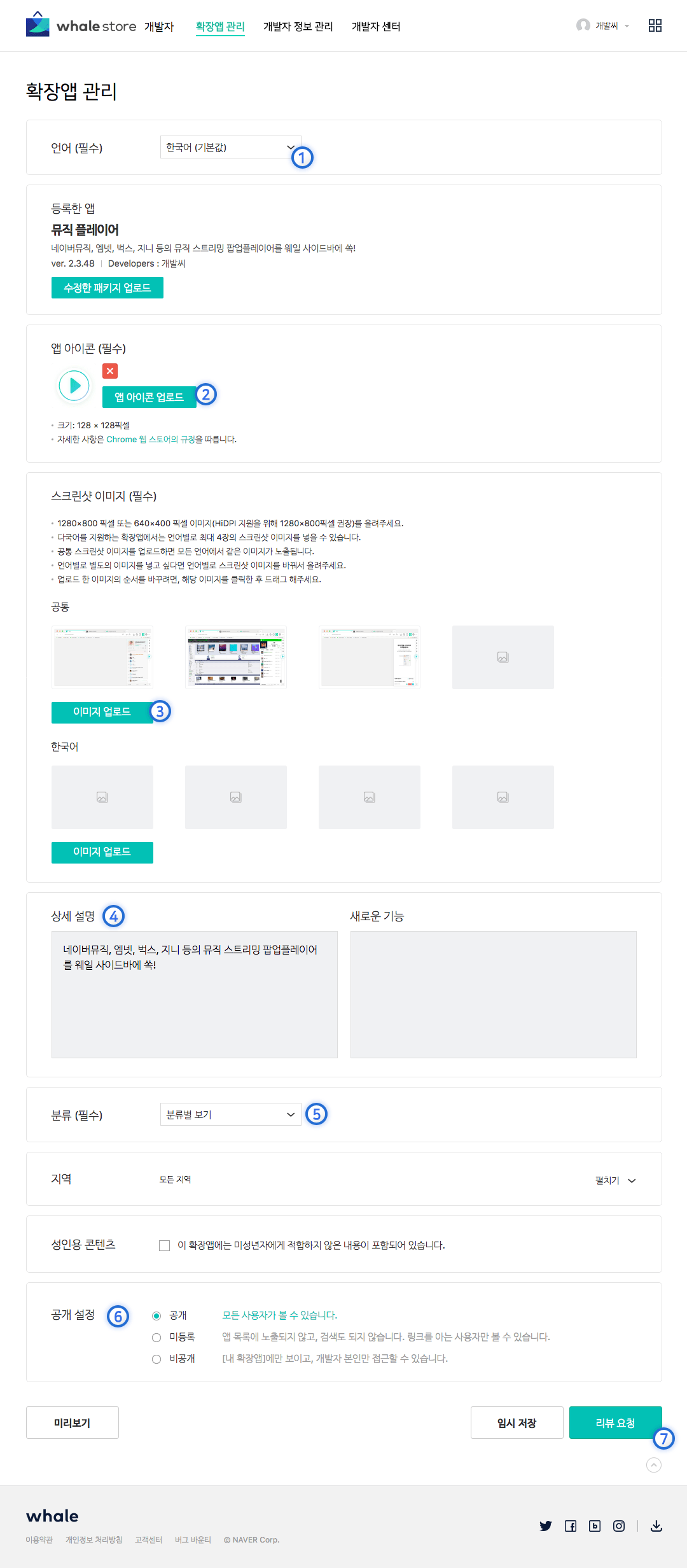 이 단계에서는 다른 사용자들은 이 확장앱을 설치하거나 스토어에서 확인할 수 없습니다. 각 필수 항목을 입력하고 미리보기 버튼을 눌러 스토어에 등록되면 어떤 모습일지 미리 확인해 본 뒤, 리뷰요청 버튼을 눌러 스토어 등록을 요청할 수 있습니다. 리뷰가 완료되면 웨일 스토어에 등록되고 다른 사용자들이 내가 등록한 확장앱을 설치할 수 있는 상태가 됩니다.