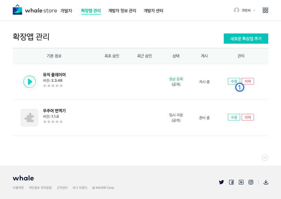 - 웨일 스토어 개발자 페이지에 접속합니다.