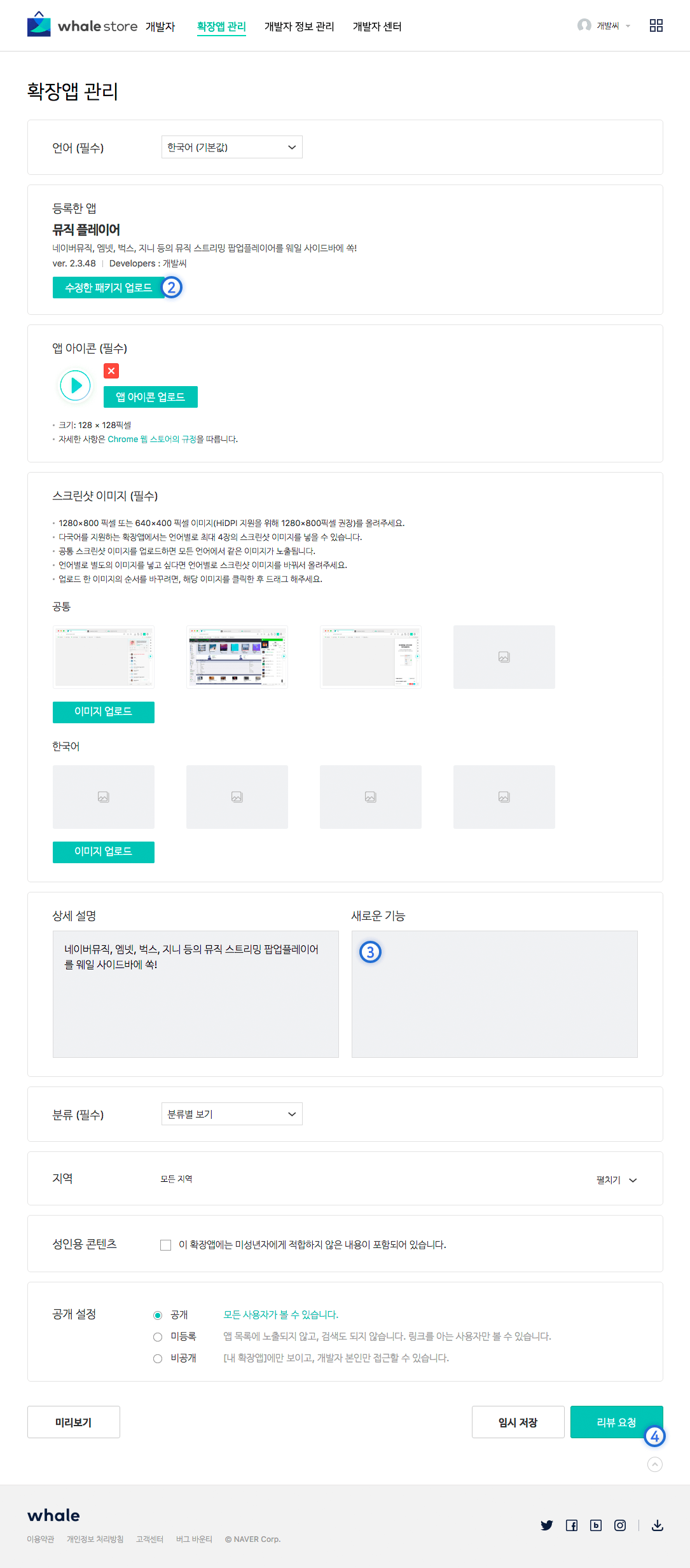 새롭게 리뷰 절차를 진행하므로 상세 설명, 아이콘 이미지, 스크린샷, 분류 등 처음 확장앱 등록시 입력했던 항목들도 수정할 수 있습니다.